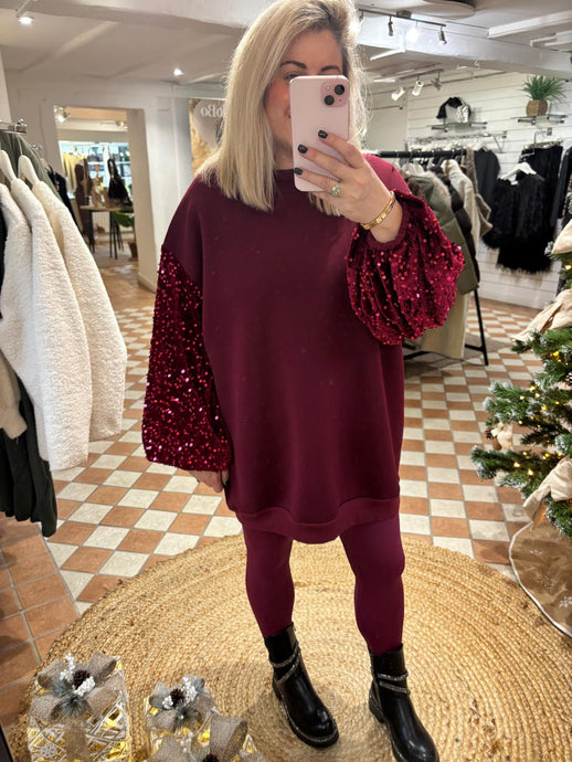 Sequin Sleeve Jumper Dress - Wine
