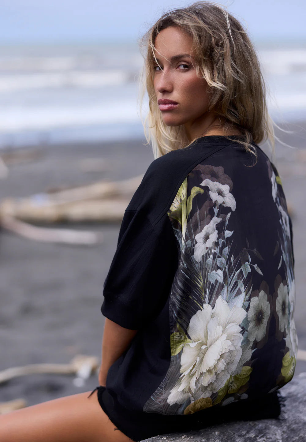Introducing the Citrine top, a modern update on the basic sweat jumper in a vibrant yellow colour. This chic piece features a fabric mix of soft cotton sweat and a luxurious cupro back with our floral Camellia print in greeny yellow tones on black, offering a unique blend of comfort and sophistication. The short sleeves and crew neck provide a classic silhouette, while the hip-length and relaxed fit ensure a flattering and easy-going style. A standout detail is the praying skeleton embroidery at the hem, adding a touch of edgy elegance. Versatile and stylish, the Citrine top can be effortlessly dressed up or down, making it a must-have addition to your wardrobe. The model wears a size UK 10.. Length from the top: 61 cm. This top has an oversized fit, please go down 1 size for a smaller fit.